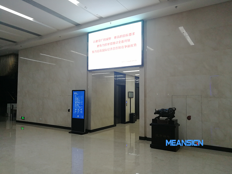 在辦公大樓大廳電梯乘坐入口處擺放落地式廣告一體機,外觀大氣簡約美觀,科技感十足,代替傳統的標識牌,展示寫字樓樓層導視,為來訪人員提供正確的樓層指引,彰顯集團的大企業風范。壁掛廣告一體機安裝在墻壁上,播放企業文化、企業宣傳片、企業通知公告、以及一些歡迎蒞臨指導內容等。